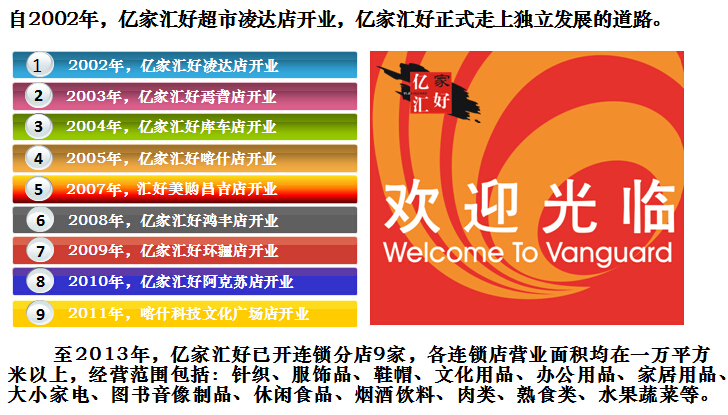 億家匯好商貿有限責任公司于2002年成立,并從臺灣引進連鎖經營職業(yè)管理團隊,統(tǒng)一管理旗下各地的連鎖超市。公司通過多年的穩(wěn)健發(fā)展,至2013年底,億家匯好商貿有限責任公司已成為擁有員工近3000多人,下轄一個配送中心和9家連鎖超市的大型綜合性零售企業(yè)。總經營面積11萬多平方米,配送中心輻射公司所有超市,年配送額可達2億元。公司大量吸納下崗職工,經過崗前培訓,提高勞動技能,實現了他們的再就業(yè),為維護社會和諧穩(wěn)定做出了貢獻。2013年,巴州億家匯好商貿有限責任公司在自治區(qū)零售業(yè)中穩(wěn)踞前三位,是自治區(qū)重要的流通龍頭企業(yè),2013年年銷售收入達10億人民幣。多年來,公司一直重管理、抓實效、運用先進的管理手段和營銷理念,秉承億家匯好人 時時尋求效率創(chuàng)新,事事講究專業(yè)技術的文化精髓,創(chuàng)造了良好的經濟效益和社會效益。公司先后多次被消費者協會評為誠信單位,并多年被評為重合同,守信用單位。